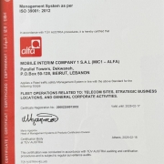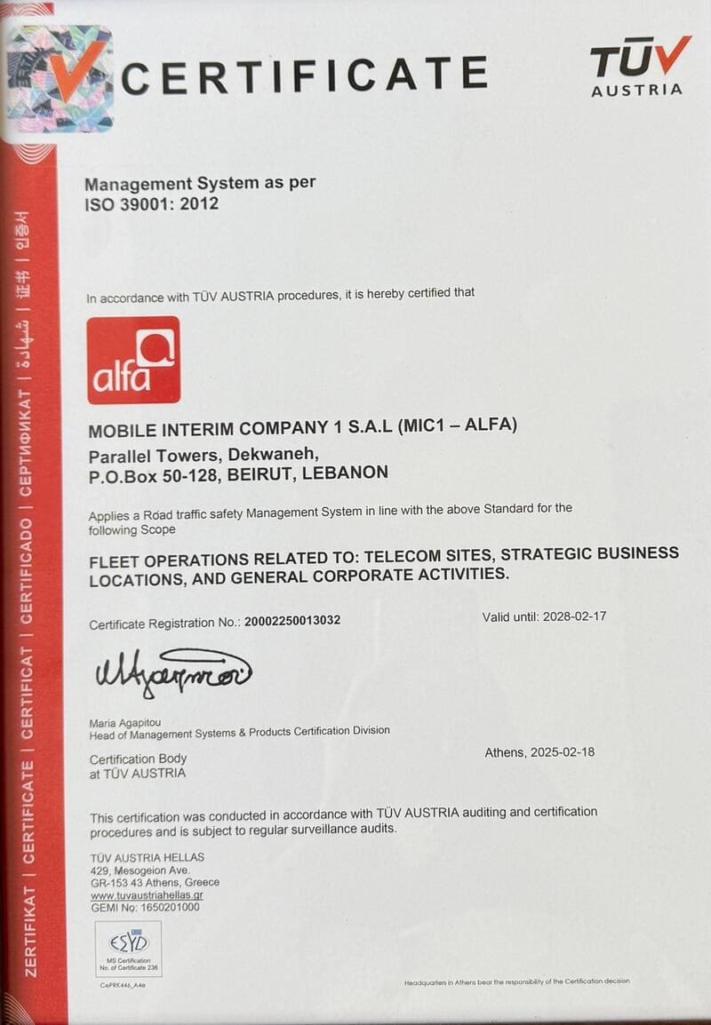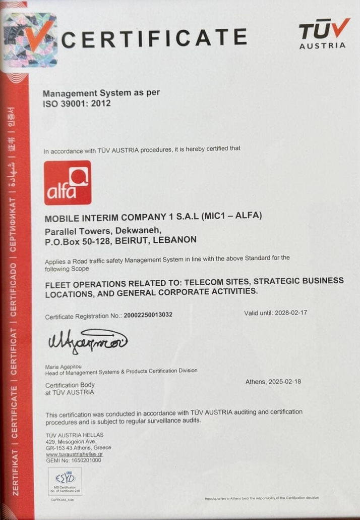 Alfa company ( Protect Ron SNC ) “Lebanon First Mobile Network” is certified from Ahead Inspection Lebanon with ISO 39001 (Road Traffic Safety).